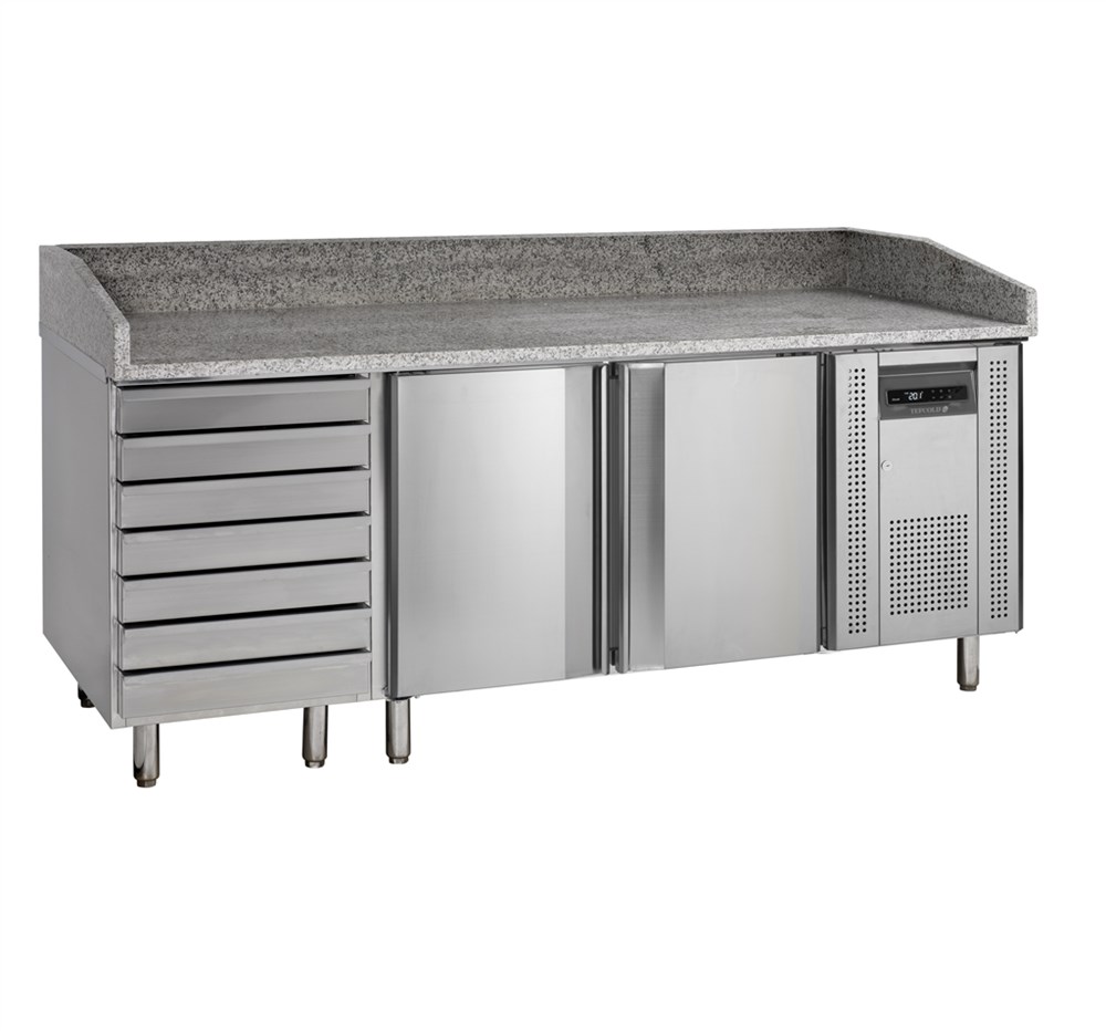 PT er en serie af pizzaborde fremstillet i SS304 rustfrit stål. De har en bordplade i granit, hvilket er ideelt, når man laver pizzaer, da granitten forbliver kold, og dermed gør det svære for dejen at hænge ved bordpladen. Fås i flere størrelser med 2 eller 3 døre. Det er også muligt at få dem skræddersyet med skuffer. Fås med eller uden køleopsats til GN kantiner – køleopsats kan også eftermonteres.